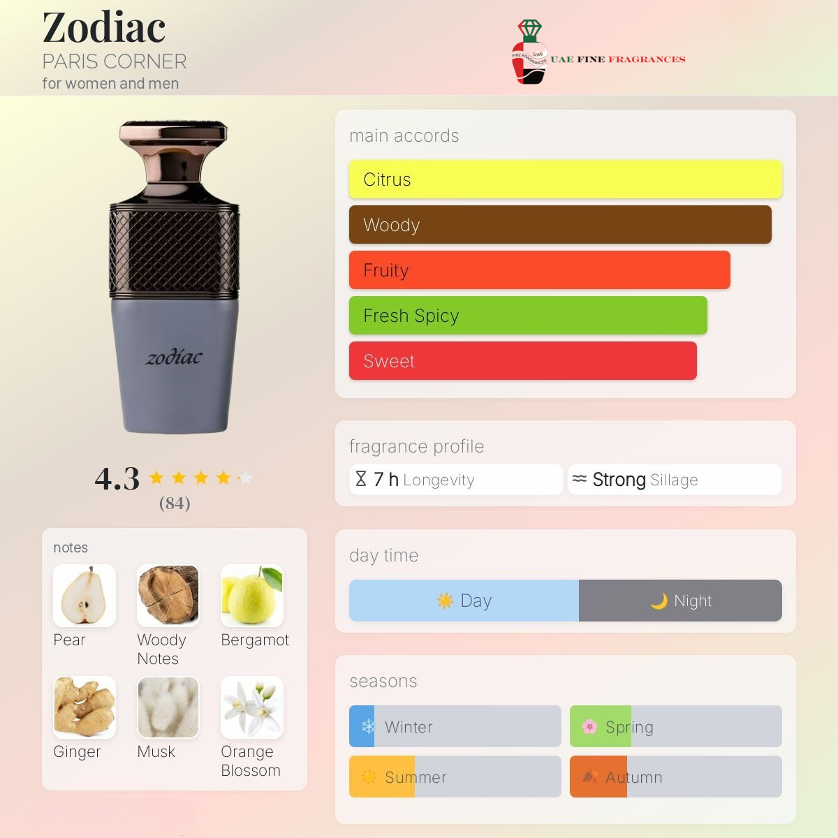 Zodiac by PARIS CORNER is a Oriental Floral fragrance for women and men. This is a new fragrance. Zodiac was launched in 2024. Top notes are Pear, Bergamot and Ginger; middle notes are Woody Notes, Orange Blossom and Jasmine; base notes are Musk, Vanilla and Amber.