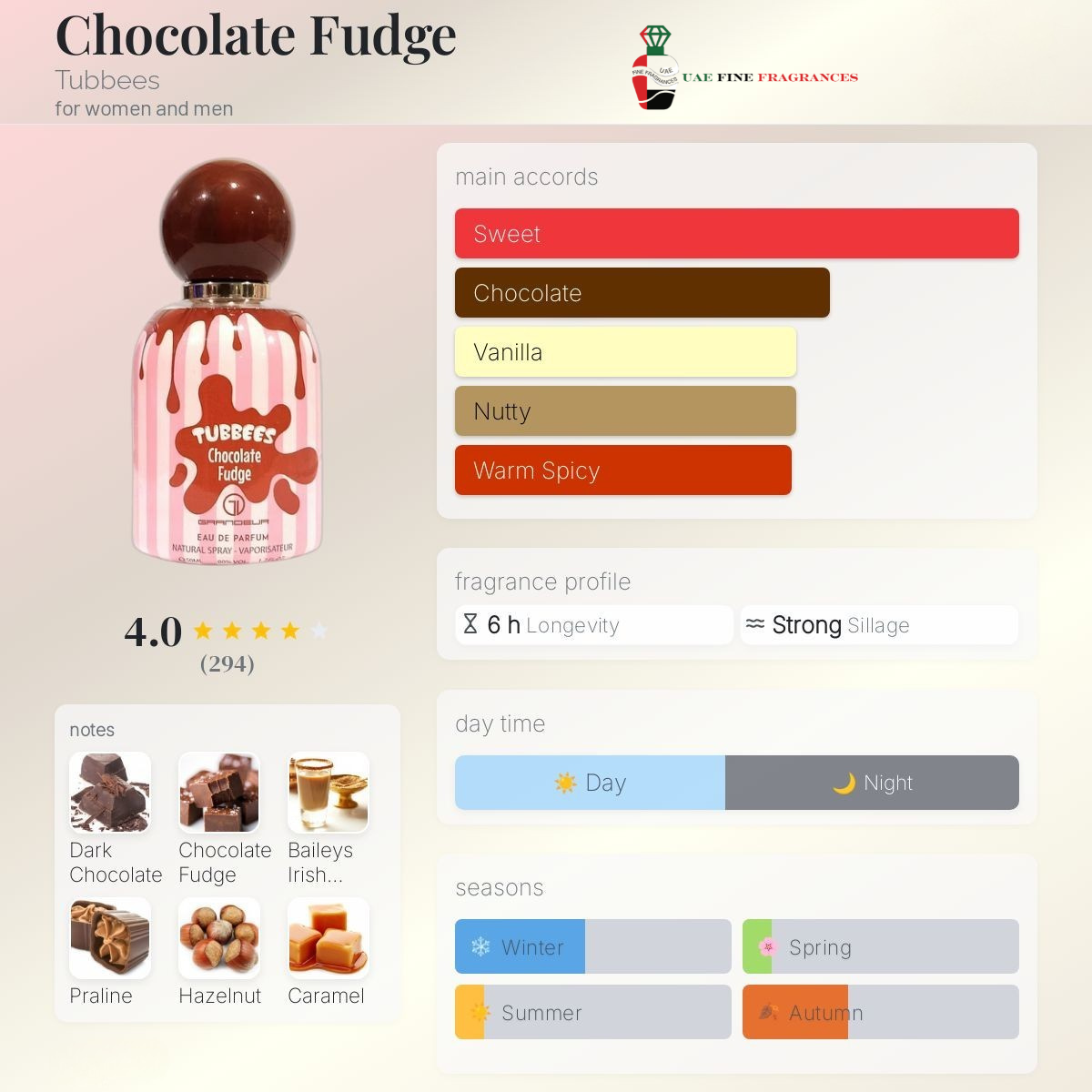 Chocolate Fudge by Tubbees is a fragrance for women and men. Chocolate Fudge was launched in 2024. Top notes are Dark Chocolate, Hazelnut and Dulce de leche; middle notes are Chocolate Fudge, Baileys Irish Cream, Caramel and Bitter Almond; base notes are Praline, Vanilla Absolute, Sandalwood and Amberwood.