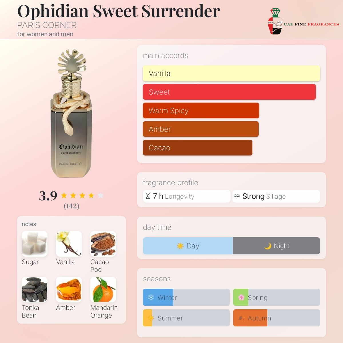 Ophidian Sweet Surrender by PARIS CORNER is a fragrance for women and men. Ophidian Sweet Surrender was launched in 2024. Top notes are Sugar, Mandarin Orange and Red Berries; middle notes are Vanilla, Cacao, Spicy Notes and Rose; base notes are Tonka Bean, Amber, Musk and Woody Notes.