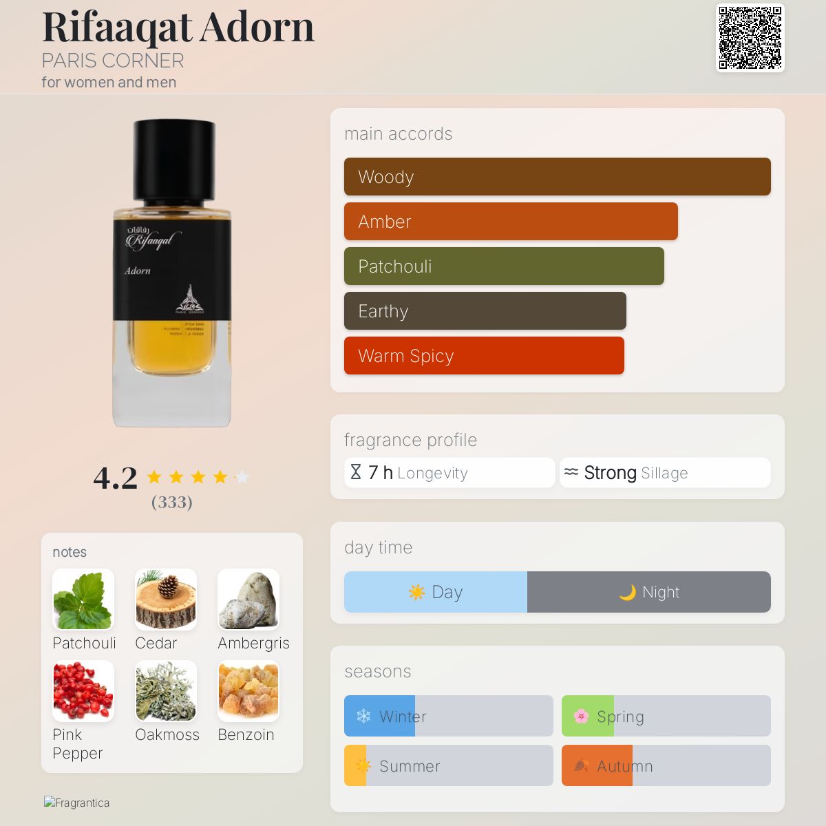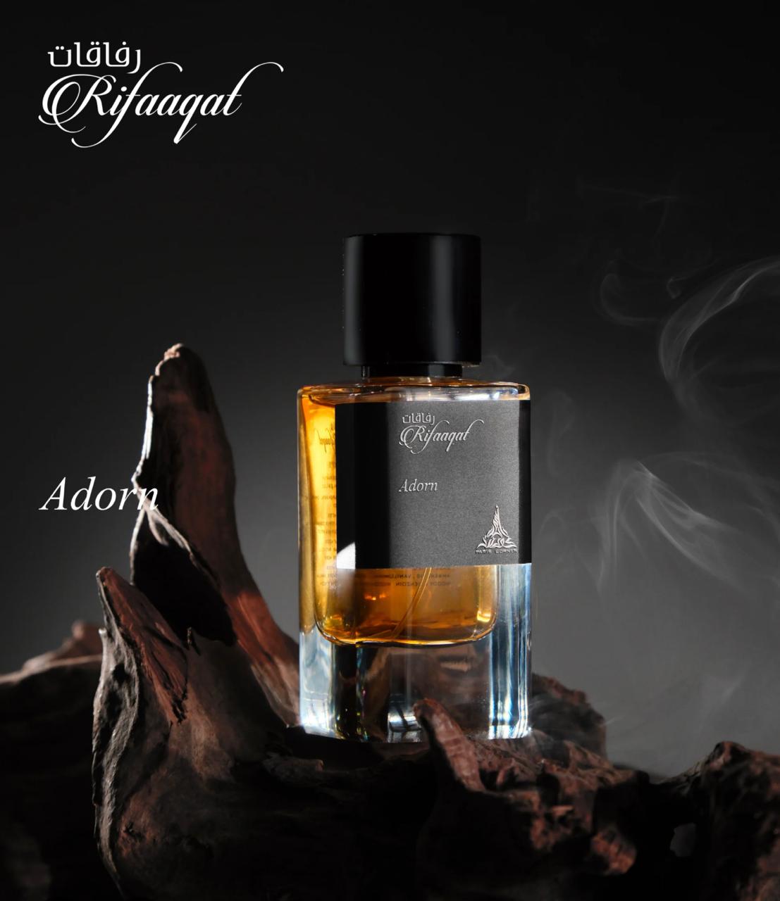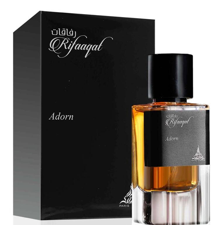 Rifaaqat Adorn by PARIS CORNER is a fragrance for women and men. Rifaaqat Adorn was launched in 2024. Top notes are Pink Pepper, Coriander, Mandarin and Violet; middle notes are Patchouli, Cedar and Oakmoss; base notes are Ambergris, Benzoin and Vanilla.