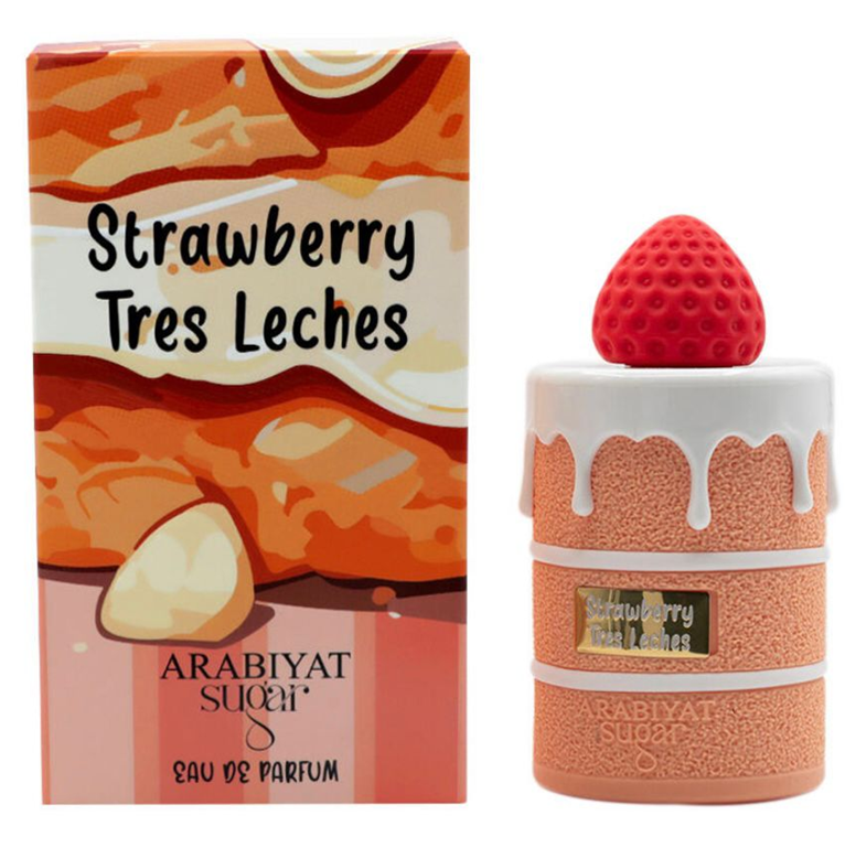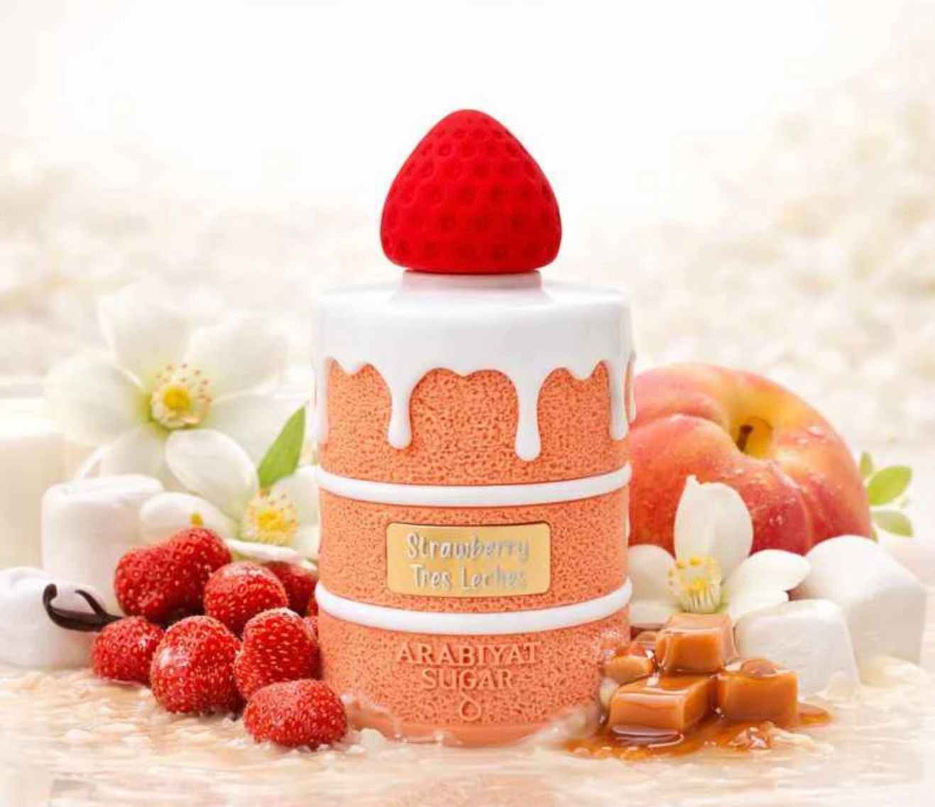 Strawberry Tres Leches by Arabiyat Sugar is a Floral Fruity Gourmand fragrance for women. This is a new fragrance. Strawberry Tres Leches was launched in 2025. The nose behind this fragrance is Belén García. Top notes are Strawberry, Milk, Nectarine and Freesia; middle notes are Marshmallow, Milk Candy, Caramel and Orange Blossom; base notes are Vanilla, White Musk and Ambergris.